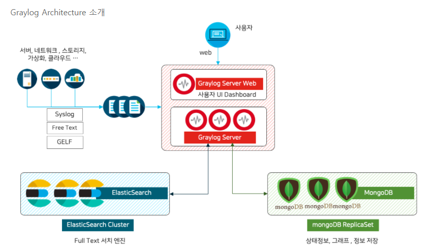 -Graylog Server = 다양한 Input에서 발생하는 로그를 구문 분석하며, 해당 로그들을 처리할 수 있는 웹 인터페이스를 제공하는 서버