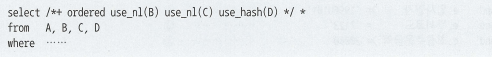 위의 그림을 해석해보면 A->B->C->D순으로 조인하되, B,C는 NL 조인으로 D는 Hash 조인으로 조인하라는 뜻이다.